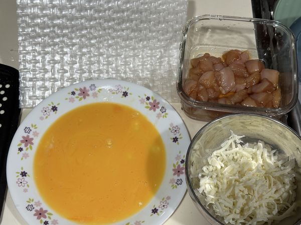 將沾滿蛋液的米紙,放上切條的雞胸肉與適量乳酪絲,準備捲起