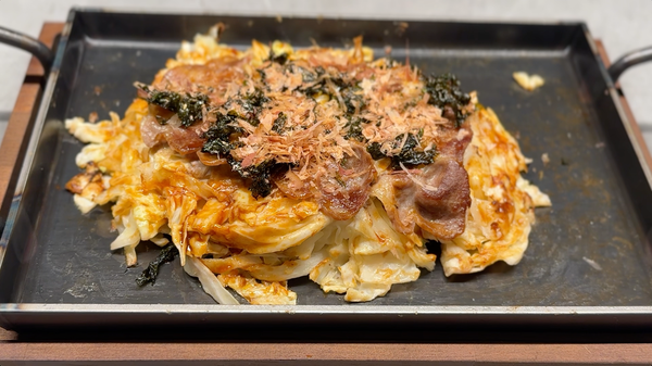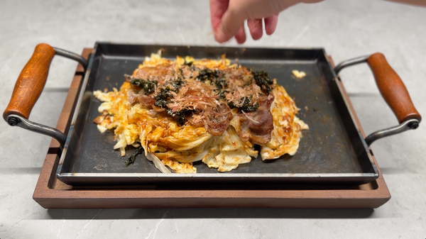 在家用鐵板做大阪燒其實一點也不難!高麗菜給好給滿,搭配簡單麵糊與梅花肉片,蓋蓋子悶熟後再翻面,外酥內軟、熱騰騰上桌。最後刷上自製醬汁,連寶寶都大讚好吃,是很適合親子一起完成的鐵板料理。