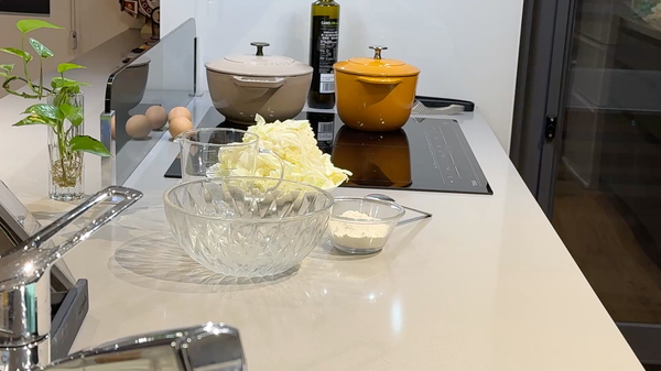 依序打散麵糊材料, 呈現有點黏稠狀, 加入高麗菜絲, 攪拌均勻